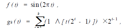 其中, t ∈R , k = 1 ,2 , ?; f ( t) 为f : t ->[ - 1 ,1 ] 的映射; gk ( t) 为gk : t ->{ 0 ,1} k 的映射. 利用映射f 和gk 分别从C1 和C2 中各映射出两组实值序列,记为:Cx 1 、Cx 2 、Cy1 和Cy2 ,且: