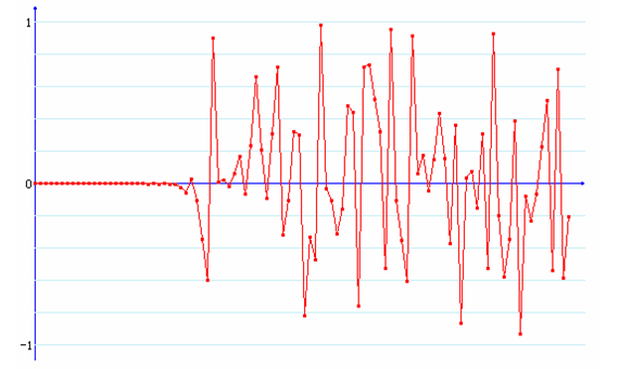 上图显示的是X0= 0.663489000和X0= 0.663489001,μ=3.99时两个Logistic序列之差的图像,很明显,在最开始20多次迭代,两者的差很小,近似等于0,但随着迭代次数的增加,两个序列的值显示出一种无规律的情形,两者相差也比较大了。因此可以看出该系统具有很好的雪崩效应。