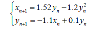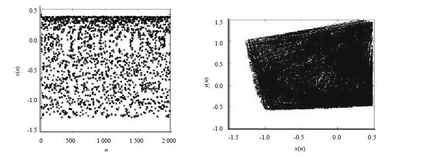 左图为logistic混沌映射分布图,右图为超混沌分布。在仿真实验中,先固定m5= −1.2, m8= −1.1, m10 =0.1;经多次实验发现,当m4 =1.52时,系统已经进入超混沌状态。公式为: