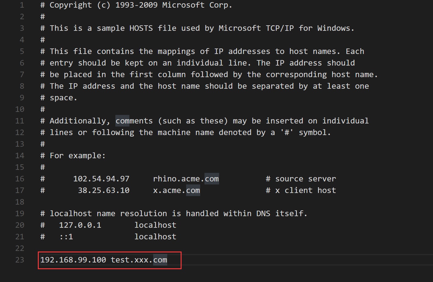 hosts文件,将nginx配置文件中填写的域名指向到Docker的IP。