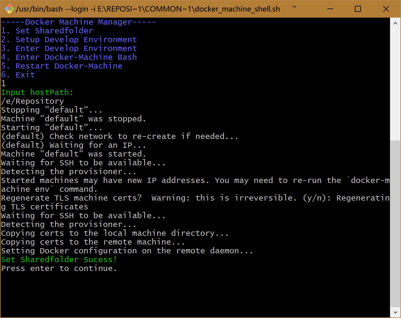 docker () { MSYS_NO_PATHCONV=1 docker.exe "$@" } export -f docker if [ $# -eq 0 ]; then echo "Start interactive shell" exec "$BASH" --login -i else echo "Start shell with command" exec "$BASH" -c "$*" fi ;; 5) #5. Restart Docker-Machine if [ "${VM_STATUS}" == "Running" ]; then "${DOCKER_MACHINE}" stop "${VM}" fi "${DOCKER_MACHINE}" start "${VM}" yes | "${DOCKER_MACHINE}" regenerate-certs "${VM}" eval "$(${DOCKER_MACHINE} env --shell=bash --no-proxy ${VM})" ;; 6) #6. exit exit ;; *) #other operation Boot_Manager ;;esac }
