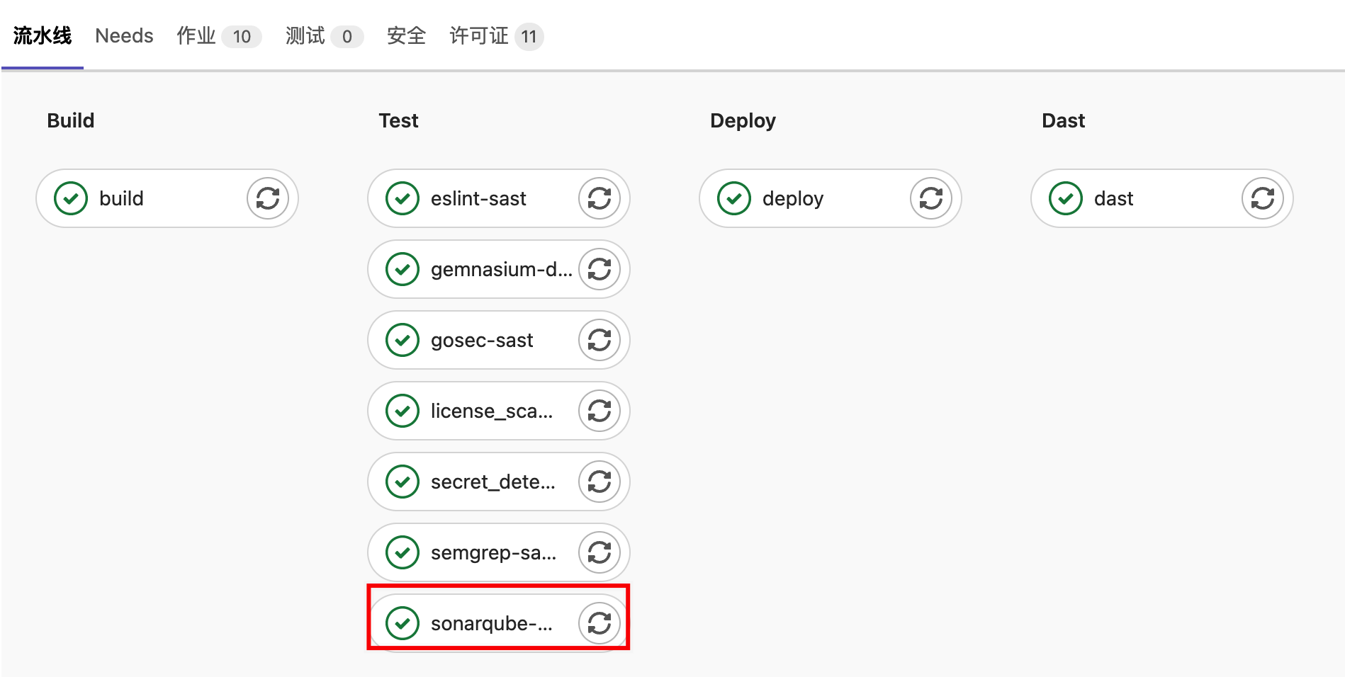 在CICD流水线中,会出现“安全”、“许可证”选项卡,可查看代码安全扫描结果。
