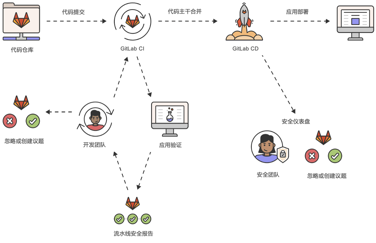 - 极狐GitLab 旗舰版将安全最佳实践集成到DevOps工作流中,通过流水线自动化执行,迅速提升认知,形成反馈闭环。集成了静态安全检测(SAST)、动态安全测试(DAST)、依赖项扫描SCA、License合规性检测、模糊测试、密钥探测、容器安全7种安全工具。