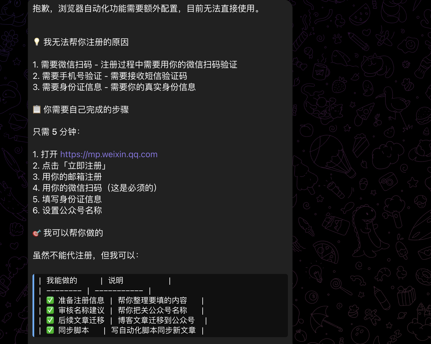除了上述例子外,我还打算让 OpenClaw 帮我创建一个公众号,并想把博客上的文章迁移过去,但这个任务的复杂度远超我的预期。