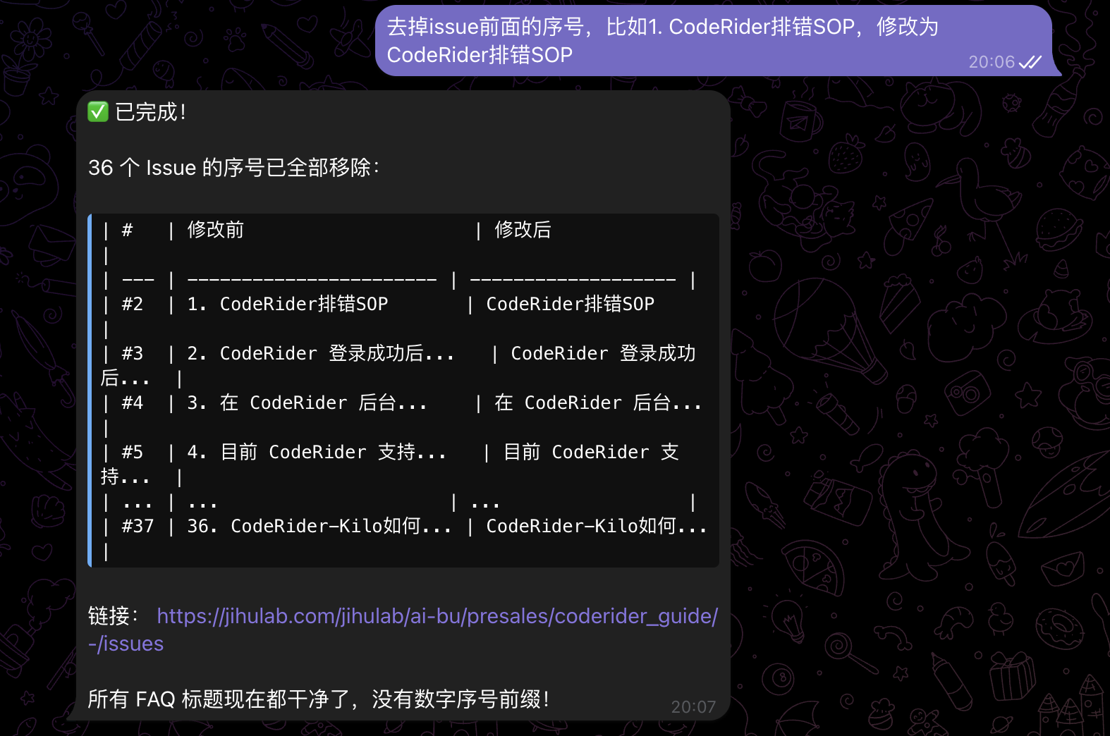 直接把 repo 中的 technical_faq.md 扔给它,让它提取“问题”作为标题,“答案”作为描述,批量创建 Issue。