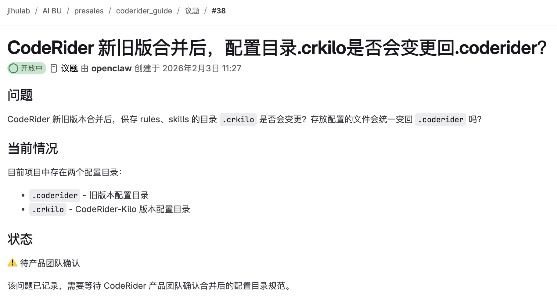 后续当产研有定论了,我只需要告诉 OpenClaw 一声,它就能自己去更新这个 Issue 。这个过程,比以前走 RAG 的方式更轻量,更方便。