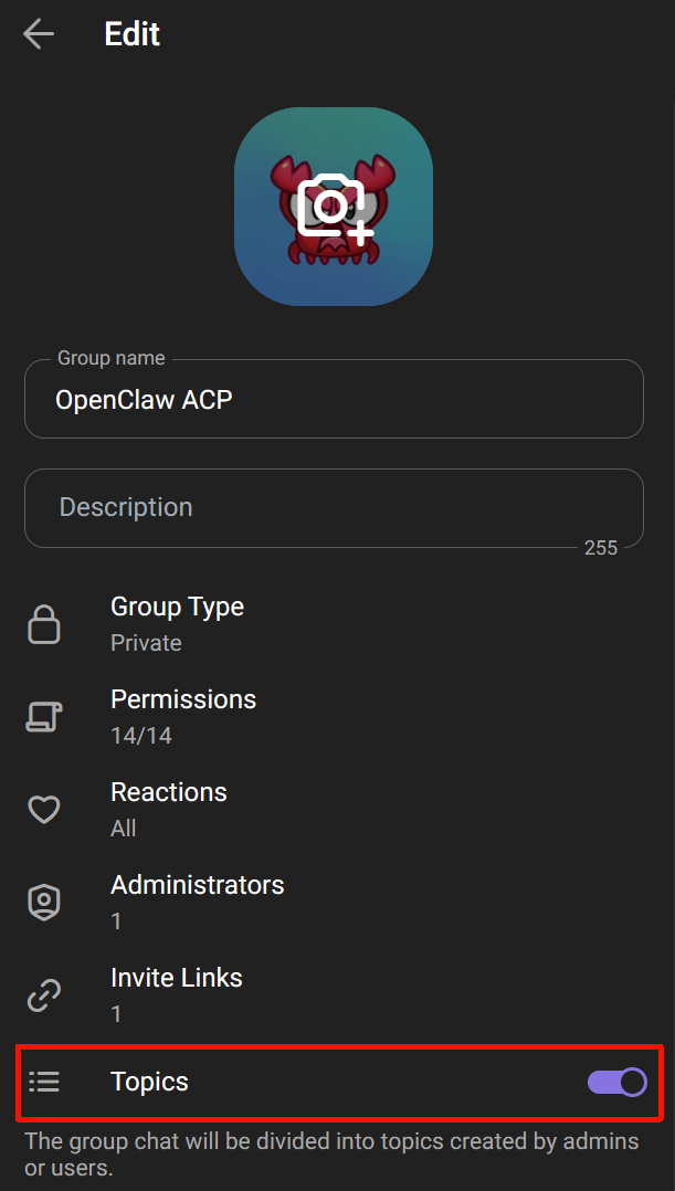 OpenClaw ACP,点击 Group 右上角的 “铅笔” 按钮进入设置: