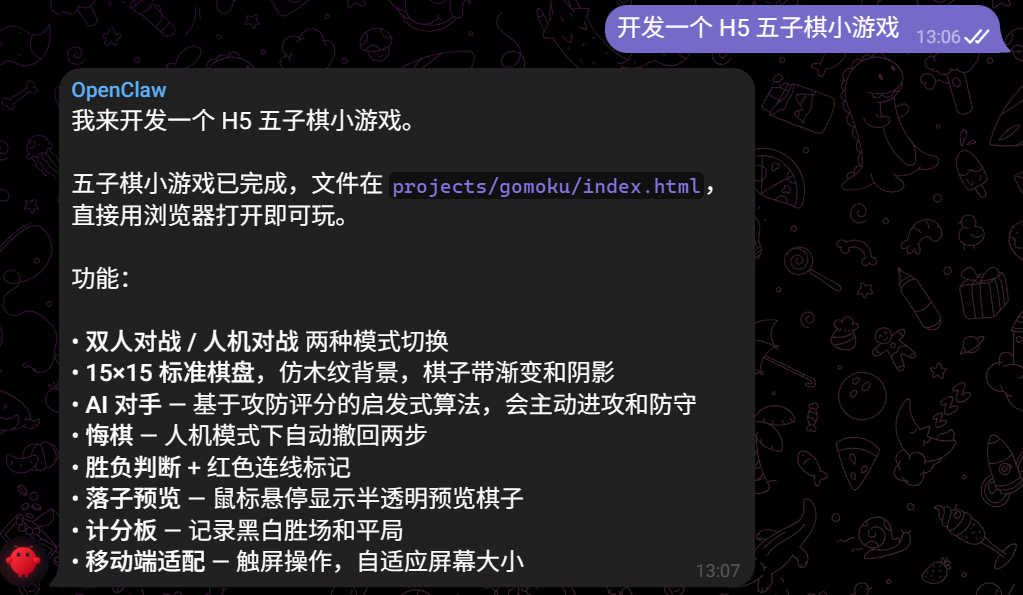}重启 Gateway 后,你就可以直接在 Telegram 的 OpenCode Topic 中,直接说 “开发一个 H5 五子棋小游戏” ,它就会直接调用 OpenCode 生成代码了。