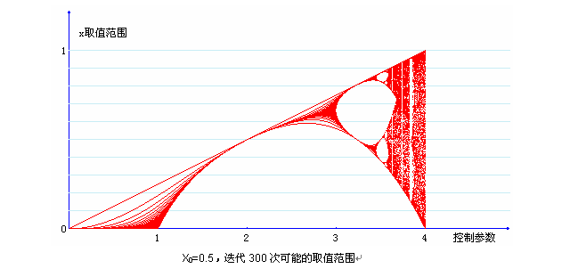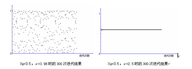 其中 μ∈[0,4]被称为Logistic参数。研究表明,当X∈[0,1] 时,Logistic映射工作处于混沌状态,也就是说,有初始条件X0在Logistic映射作用下产生的序列是非周期的、不收敛的,而在此范围之外,生成的序列必将收敛于某一个特定的值。如下图所示: