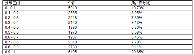 最后我们再来看看Logistic的随机分布特性,一个好的伪随机序列应该有比较平均的分布,也就是说,每个数出现的概率应该是相等的。我们对X0=0.2,μ=3.9999的Logistic混沌映射进行30000次迭代后对其值进行统计,分布情况如下表所示:
