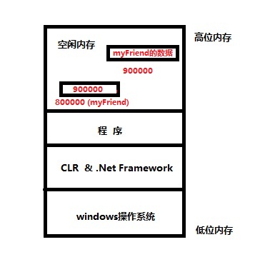 当执行myFriend = new clsPerson();实例化以后,vs再次向windows申请一个空间,来存储名为 myFriend的数据,比如创建时申请的地址为800000,值为NULL,执行myFriend = new clsPerson()后申请一个地址是900000的内存空间,里面存储myFriend类中的数据,此时800000这个地址名为myFriend内存空间的值就成了900000,也就是说将myFriend的数据关联了起来。
