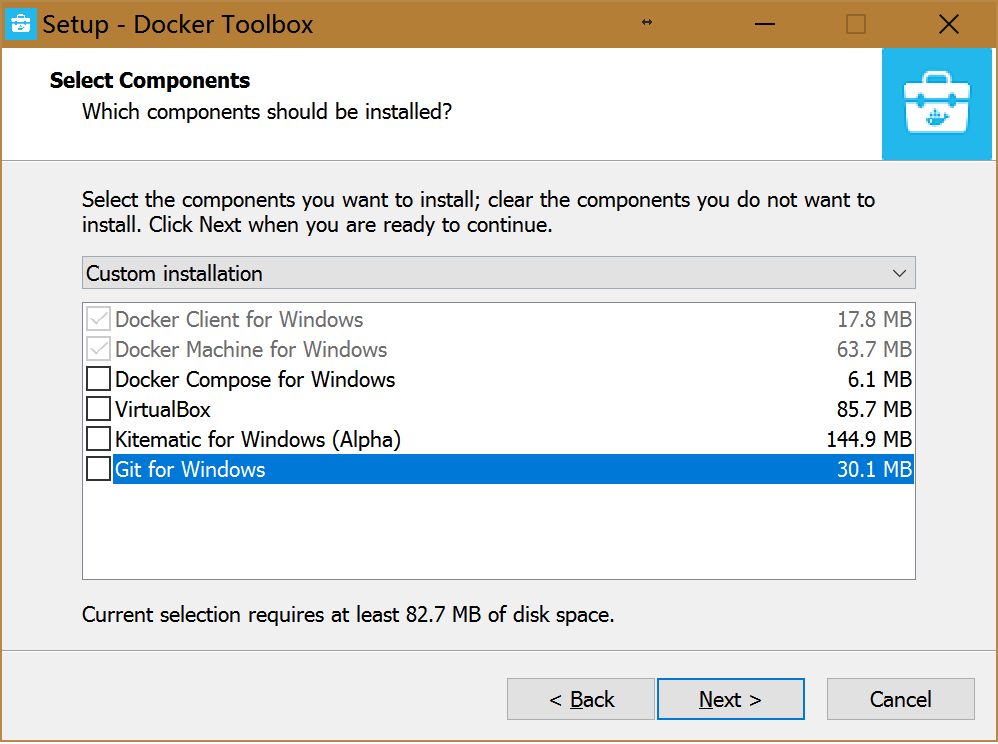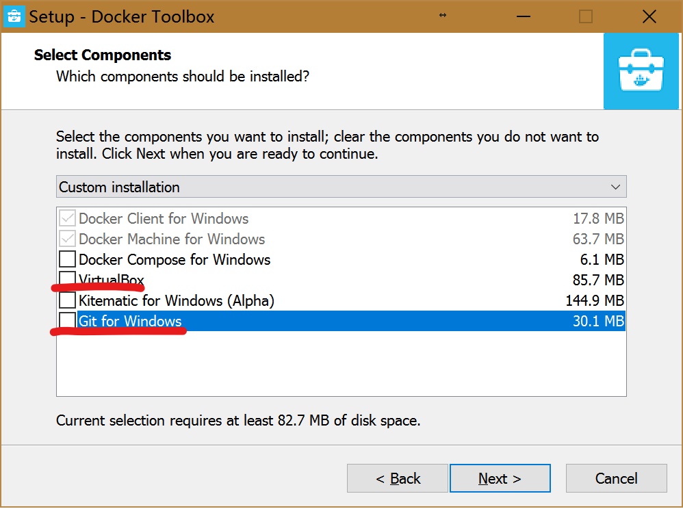 DockerToolbox.exe安装DockerToolbox。如果系统中已安装Virutal Box和Git,则不需要勾选,否则一定要注意勾选这两项。