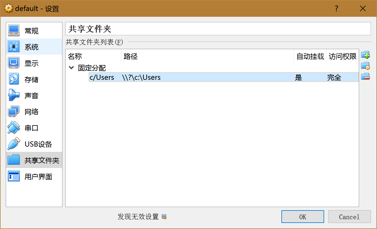 default的默认linux虚拟系统的配置。在共享文件夹一栏中可以看到,默认配置中,已经将本机C盘的User文件夹共享给linux虚拟系统。本机的其他目录并没有和虚拟机有连接。也就是说Docker通过Volume与宿主机共享文件,要想Docker和本机有数据交互,就先把本机目录共享给虚拟机(宿主机),再由虚拟机挂载到Docker上。