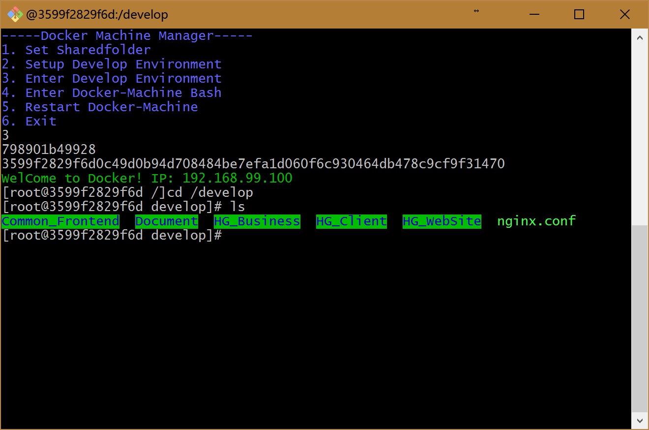 3,回车,进入Docker容器,绿色文字提示WelCome to Docker! IP: 192.168.99.100,即为成功,使用这个IP就可以访问Docker。使用命令cd /develop,即可进入第3步中挂载的本地工作目录。注意,步骤1-4只需要执行一次,安装完成后,需要时只执行这一步骤即可进入Docker!除非需要更换工作目录,或更新、重装整个环境,按需要再次执行1-4步。
