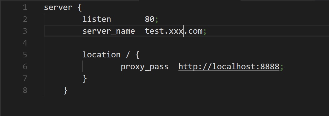 listen端口,修改server_name为所需的域名,修改location为本地nodejs服务路径。