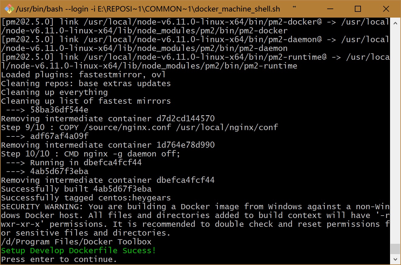 2,回车,等待安装开发环境的镜像,直至出现绿色文字Setup Develop Dockerfile Sucess!。按回车继续。