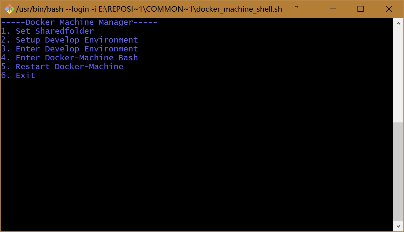 docker () { MSYS_NO_PATHCONV=1 docker.exe "$@" } export -f docker if [ $# -eq 0 ]; then echo "Start interactive shell" exec "$BASH" --login -i else echo "Start shell with command" exec "$BASH" -c "$*" fi ;; 5) #5. Restart Docker-Machine if [ "${VM_STATUS}" == "Running" ]; then "${DOCKER_MACHINE}" stop "${VM}" fi "${DOCKER_MACHINE}" start "${VM}" yes | "${DOCKER_MACHINE}" regenerate-certs "${VM}" eval "$(${DOCKER_MACHINE} env --shell=bash --no-proxy ${VM})" ;; 6) #6. exit exit ;; *) #other operation Boot_Manager ;;esac }