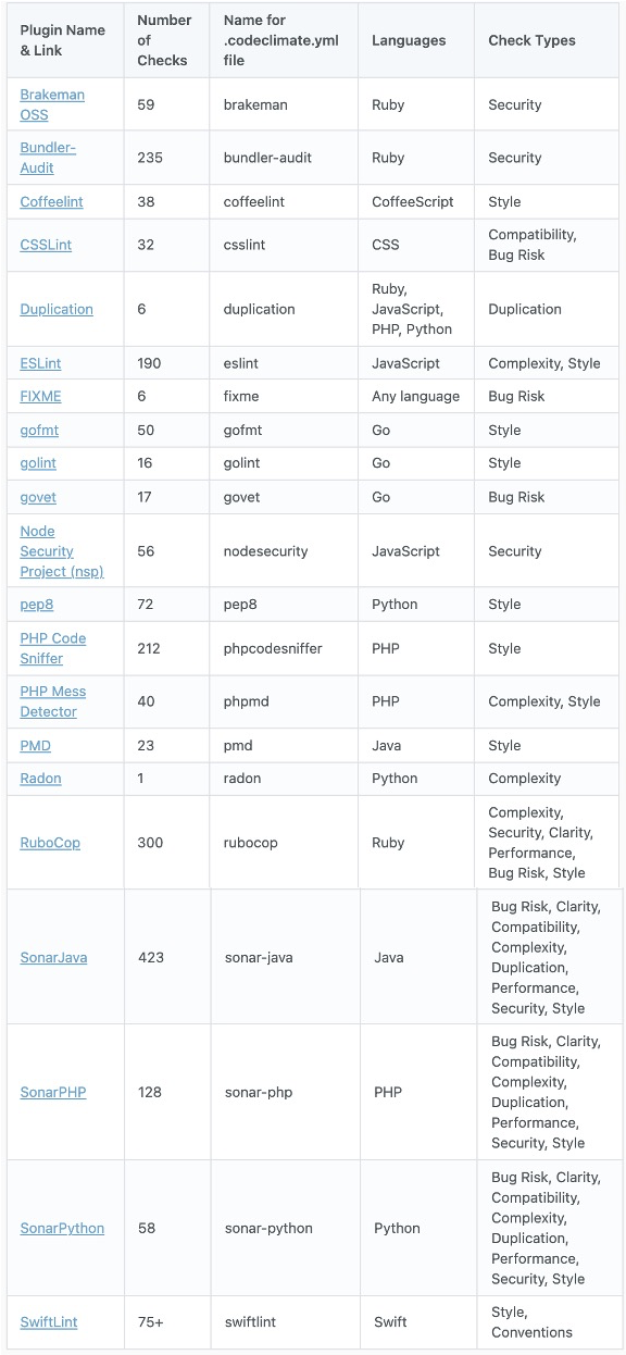 GitLab代码质量扫描集成的是Code Climate这款开源工具,它支持多种语言,多种质量类型,支持自定义规则,具体见 Available Analysis Plugins (codeclimate.com)
