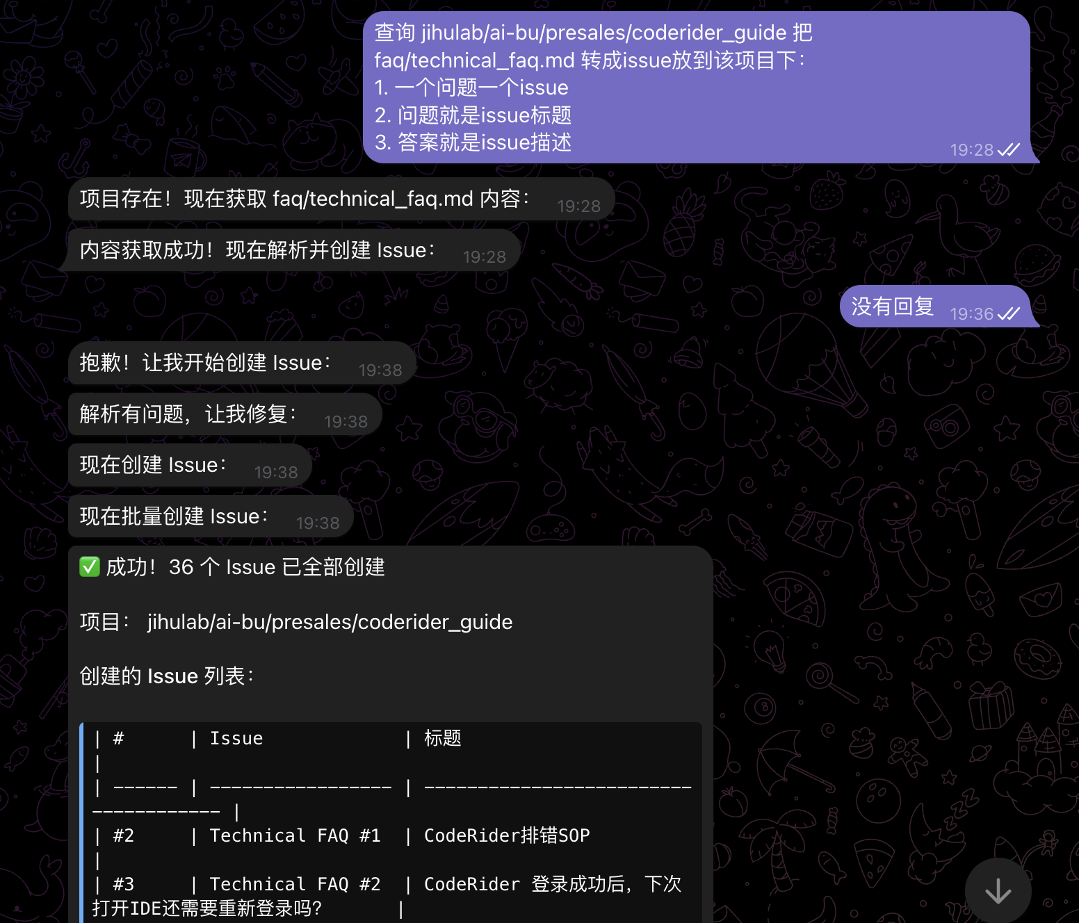 直接把 repo 中的 technical_faq.md 扔给它,让它提取“问题”作为标题,“答案”作为描述,批量创建 Issue。