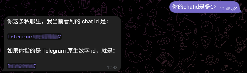 - 进入 OpenClaw Bot 与它对话,问它 “你的 chatid 是多少” ,并记录: