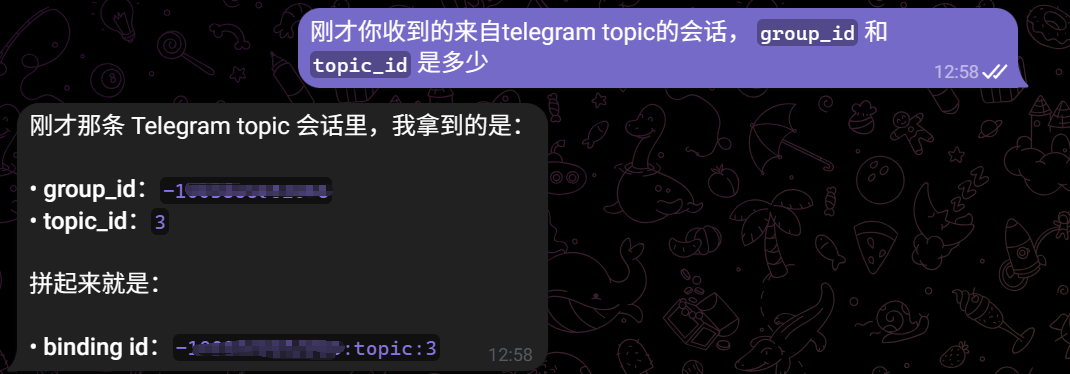 再回到 Telegram 的 OpenClaw Bot 中,问它 “刚才你收到的来自 telegram topic 的会话, group_id 和topic_id 是多少?” ,并记录:
