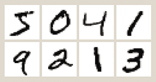 每个 MNIST 图像是一个单一的手写的数字字符的数字化的图片。每个图像是 28 x 28 像素大小。每个像素值是 0,表示白色,至 255,表示黑。中间像素值表示的灰度级。