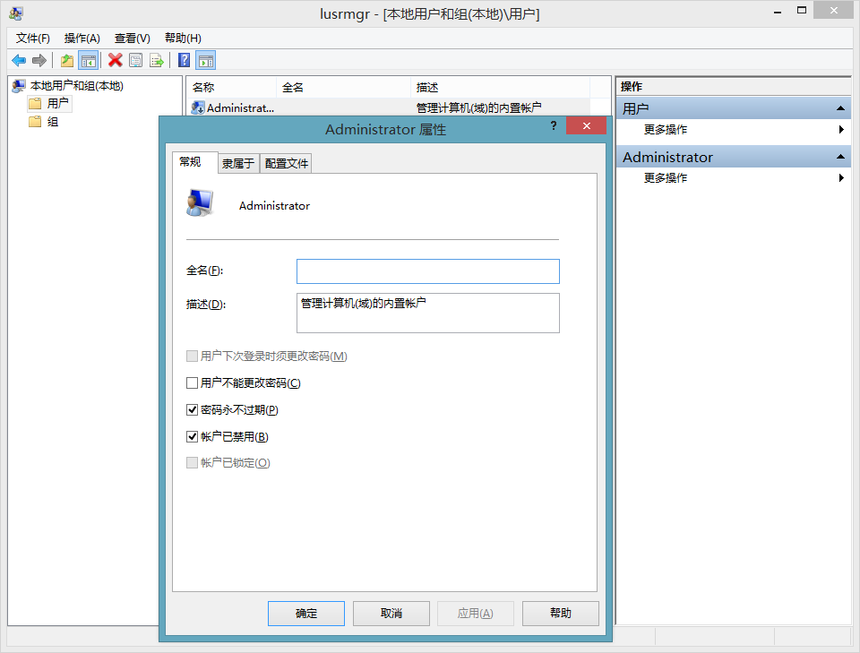 lusrmgr.msc - 本地用户和组–用户–administrator–去掉“账号已禁用”的勾,确认退出