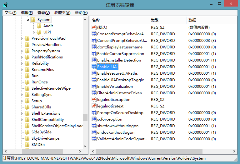 进入注册表编辑器,发现并没有这样一个值,不过却发现了EnableLUA,其实EnableUIPI是visita下的值,而在win7/win8下则是EnableLUA.