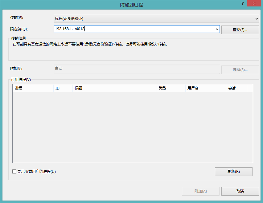6.在传输一栏中选择“远程(无身份验证)”,在限定符一栏填写远程计算机ip和msvsmon.exe设置的端口号,然后点击“刷新”即可看到远程计算机的进程,选择需要调试的进程即可