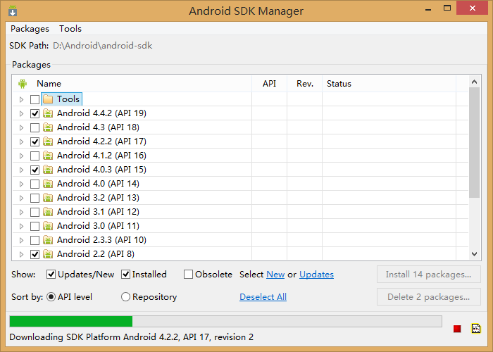 SDK Manager.exe下载工具包以及插件,其中Platform-tools,Biuld-tools需要勾选,API请按照需要自行勾选: