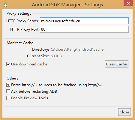 另外由于谷歌被墙,可能导致无法连接到服务器,可以配一个镜像代理,在SDK Manager中点击Tools–Options,设置Http代理: