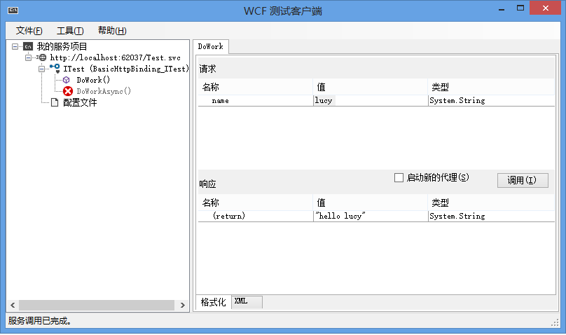 }5> F5运行程序,VS会启动WCF客户端测试工具。双击DoWork方法,填入一个值,点击调用,即可看到结果。