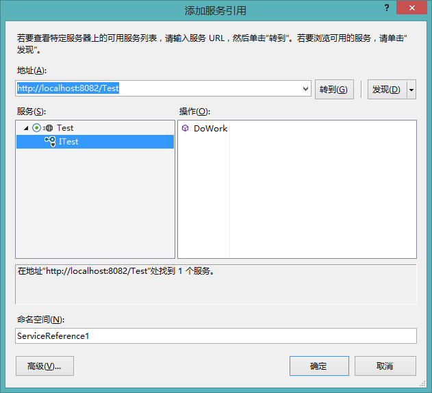 2> 添加引用服务,地址填写host的地址http://localhost:8082/Test,点击转到,然后确定