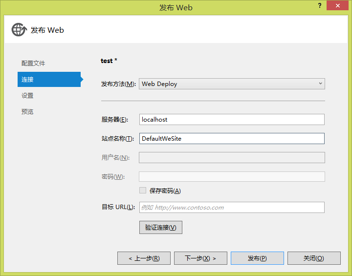 3> 服务器填写localhost,站点名称填写IIS中建立好的站点名,目标url填写后可以让浏览器在发布后自动打开这个目标url。点击发布即可。