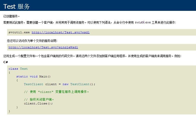 4> 用iis启动这个网站,点击Test.svc,出现如下界面说明部署成功