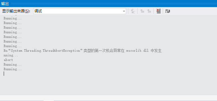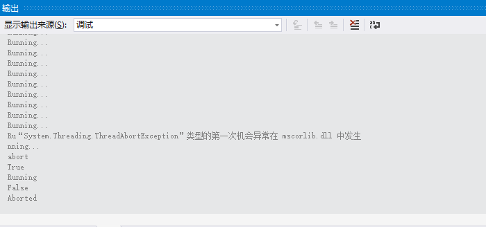 点击Button执行Abort后立即输出thread的状态,发现IsAlive=True,ThreadState=Running,当然也有可能是IsAlive=False,ThreadState=Aborted,因为Abort是不稳定的。然后停一段时间确保thread被终止再点击Button1输出thread的状态,此时IsAlive=False,ThreadState=Aborted.